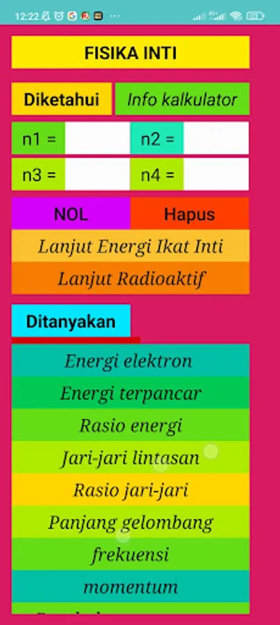 This application aims to help students to check the answers to physics questions. With a complete list of calculators, ranging from classical physics to modern physics, it is hoped that it can provide benefits in a positive direction for the advancement of education in Indonesia.