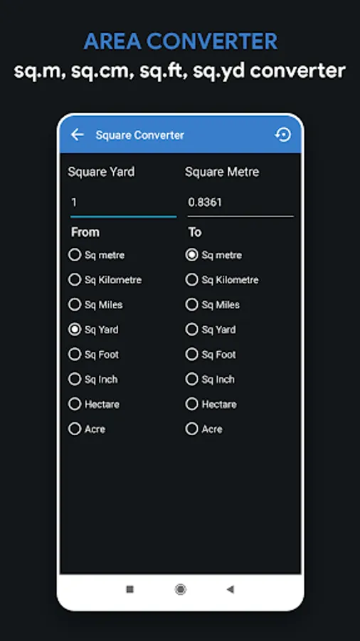 Single tap to convert square meter to square feet, square feet to square meter converter calculator.