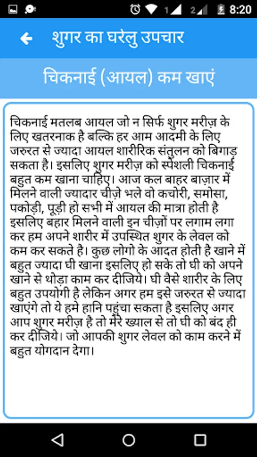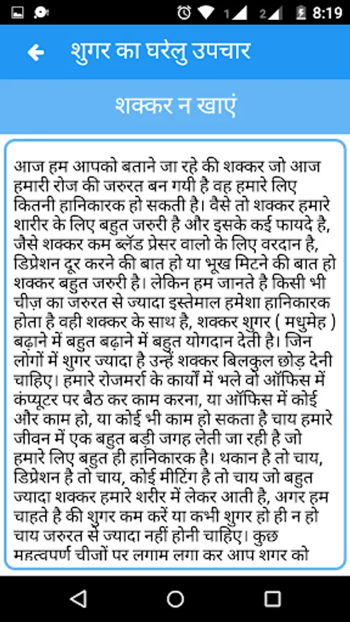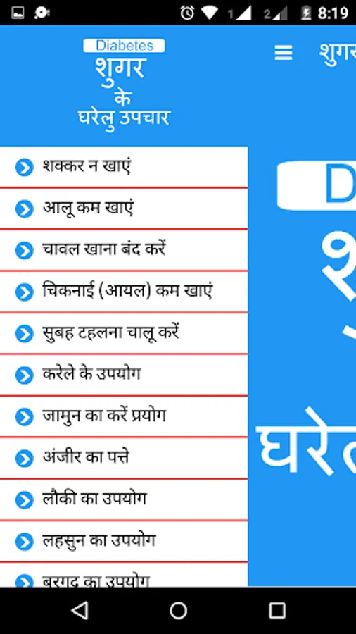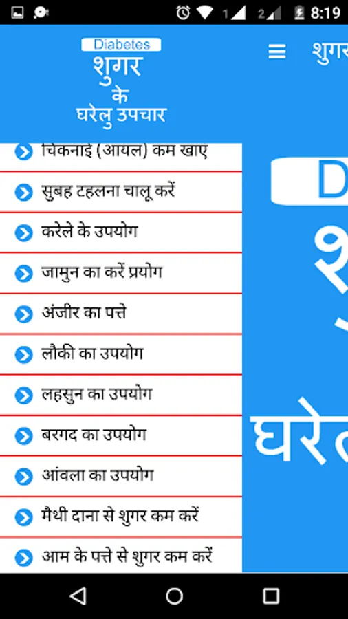 Ye application un logo ke liye bahut jaruri hai jo Sugar / madhumeh ke mareej hai. Is application me bataye gye achuk aur anokhe upchar se sugar ke level ko bahut had tak kam kiya ja sakta hai. sugar ke ilaj ke liye is application ko koi bhi sugar ka mareez prayog kar sakta hai sari detail hindi me batayi gyi hai. Is application is sahayata se app sugar ka ilaj asani se kar sakte hai wo bhi ghar baithe. Ab karen sugar ka ilaj hindi me is application ke sath.