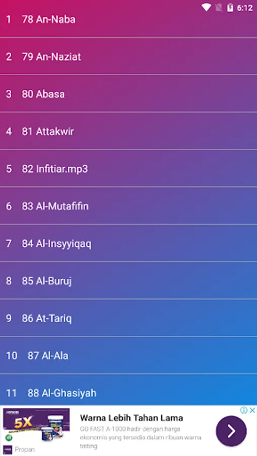 Berikut urutan surat dalam Juz Amma atau juz 30, dengan format: nomor urut surat, nama surat, dan jumlah ayat.