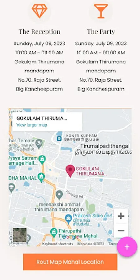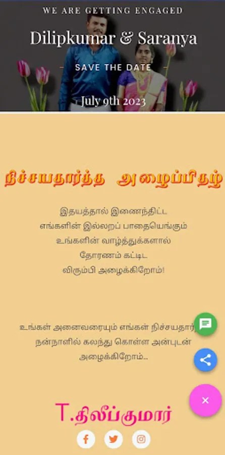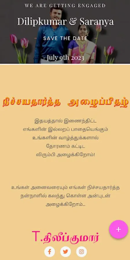 This is T.Dilipkumar wedding invitation app, This app contains marriage invitation with download option, events to be held on marriage ceremony , time schedules and route maps.