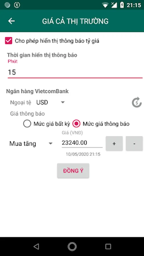 - Receive notification of VietcomBank foreign exchange rate changes according to desired threshold