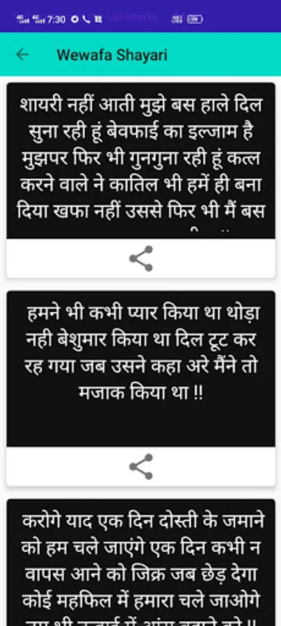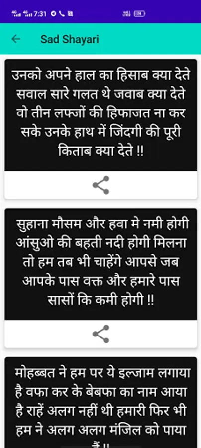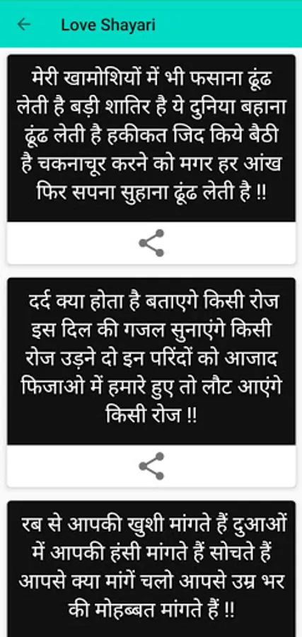 This app contains one of the best Shayari app. you can read any Shayari and share easily to everyone (any social media).