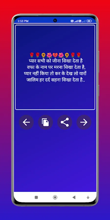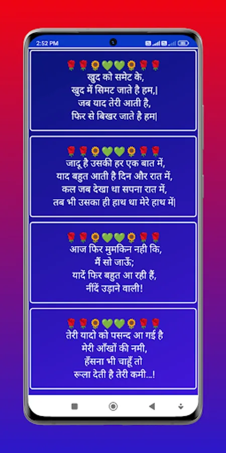 This apps feature a user-friendly interface and a vast collection of shayaris. Users can browse shayaris in different categories like Love, Pain, Heartbreak, Loneliness, Separation, and more. Additionally, users can mark their favorite shayaris and share them with friends and family on various social media platforms or messaging apps.