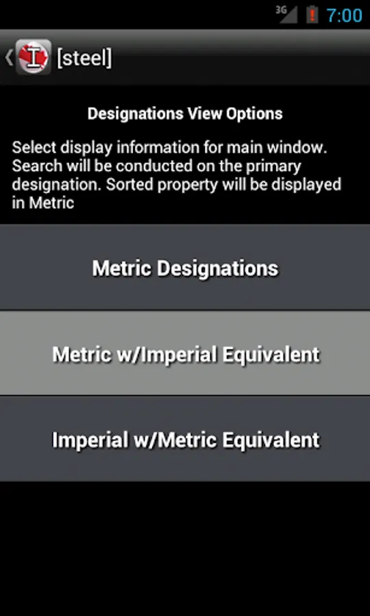 - Imperial Designation + Metric Equivalent, both metric and imperial names displayed, search conducted on the imperial values.