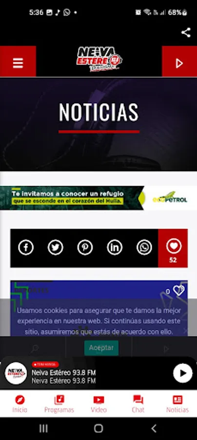 We are the one who accompanies you in all the moments of life. Neiva Estéreo 93.8 on FM and www.neivaestereo.fm on the Internet is entertainment. It is information. It's your company on the radio, on the cell phone, on the office PC. From there arises a great responsibility that translates into the leadership we have assumed. We are happy and we promote our own music, that of our culture, without being radical in tasting other trends. This is how we promote local artists who do not have the opportunity to sound on commercial stations. We also fill our programming with information and participation moments from the different social expressions of our community. That is why you find varied music, of all genres, at the time you listen to the opinion of the people of Neiva about issues of our reality and you inform yourself of what happens here, in Colombia and in the world, with content, analysis, and commentaries of announcers and journalists of the region.