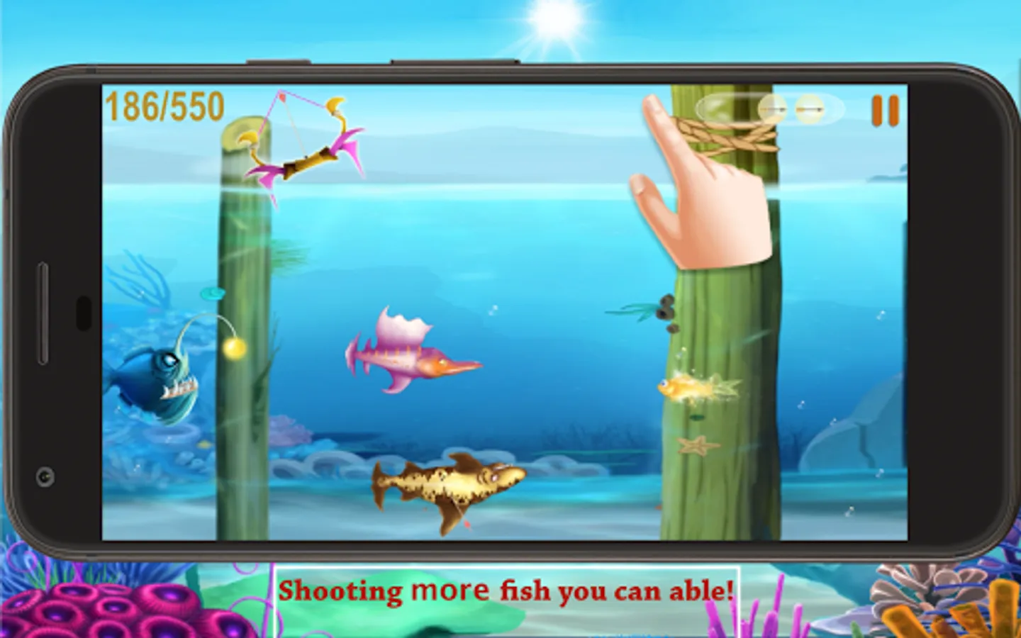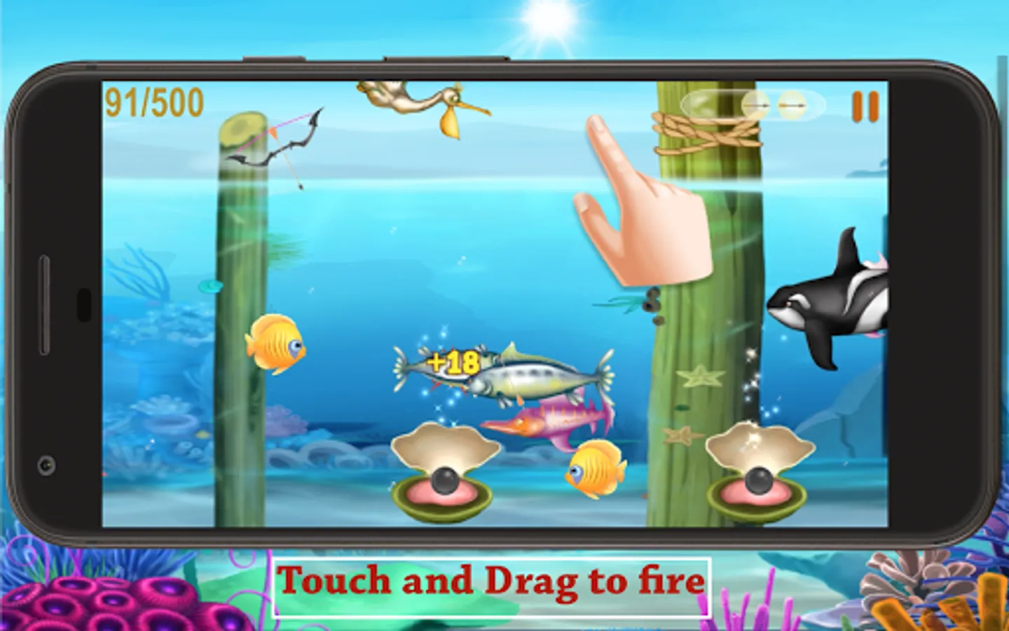 - In game you control a bow to shoot fish. Touch and Drag to archery on the fishs.