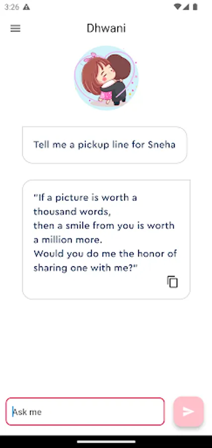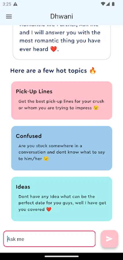 Our app provides romantic pickup lines that will surely get a smile from your date or loved ones and break the ice. We also offer creative and unique date ideas to help you plan the perfect outing.