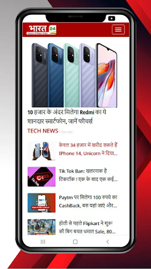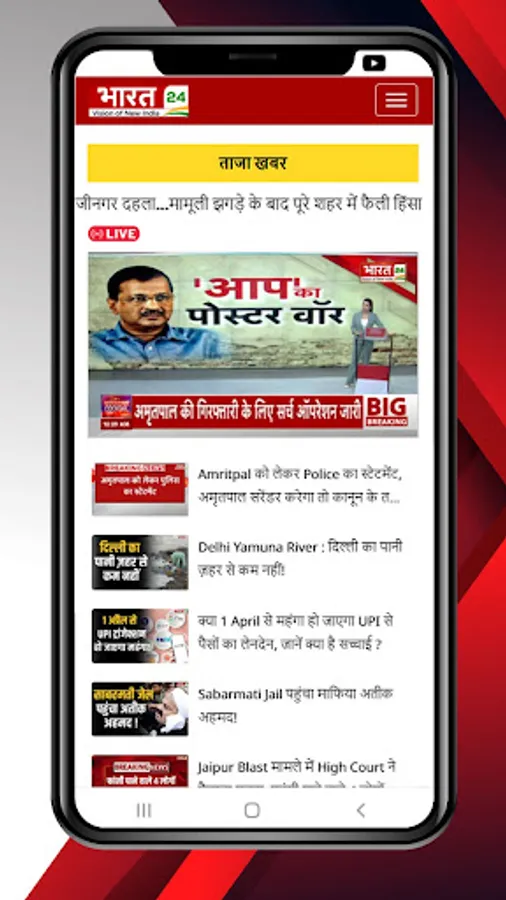 The official Bharat24 Hindi News TV app brings you the latest news. We offer Hindi News (हिंदी समाचार) through Live TV, Videos, Debate and Shows. This app brings you Breaking News (ब्रेकिंग न्यूज़), Business News, Bollywood News, National News Updates, Lifestyle and Entertainment News, Technology News, International News etc.