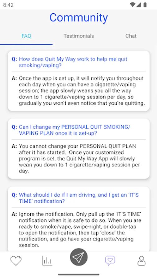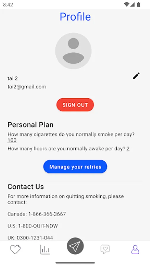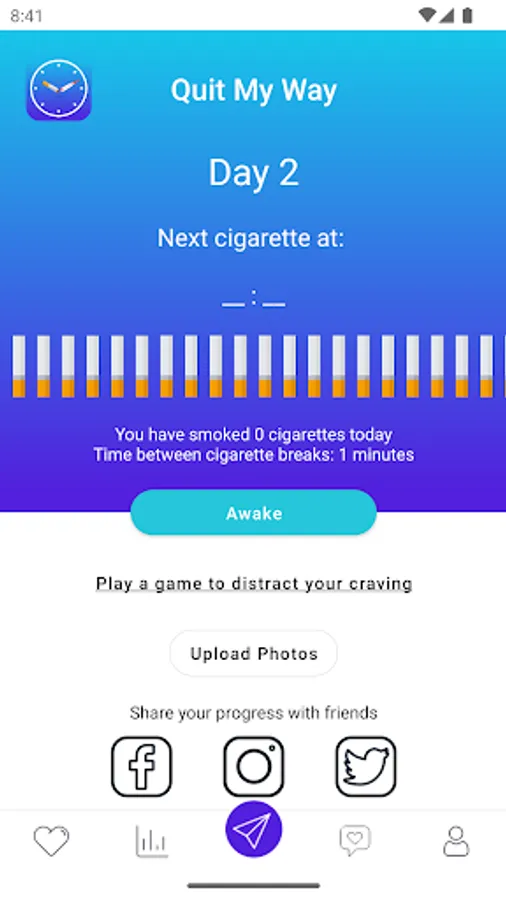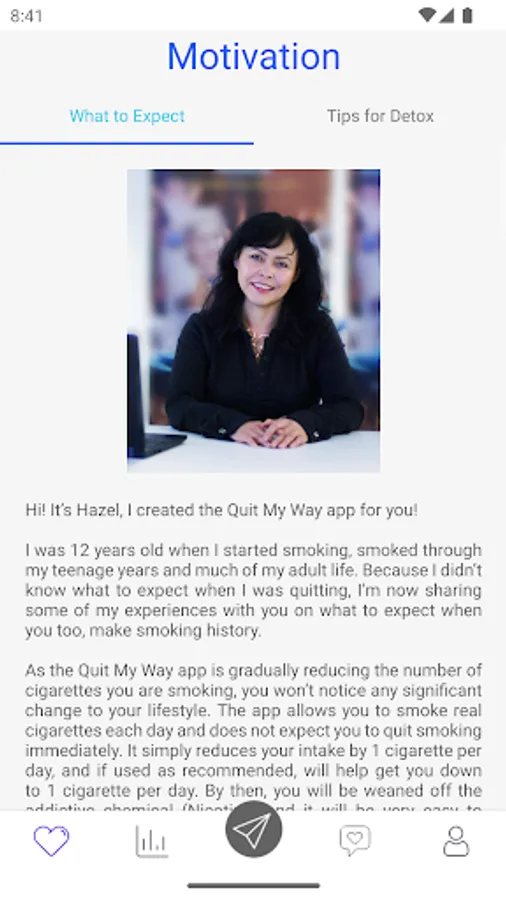 We've helped customers around the world achieve their goals of healthy, nicotine-free living by educating, motivating and supporting them through the app. Your personalized Quit My Way program gives you real-time feedback on how many cigarettes or vaping sessions you've used during the day, how many you have left, as well as support notifications each day. evening to help you stay motivated and on track.