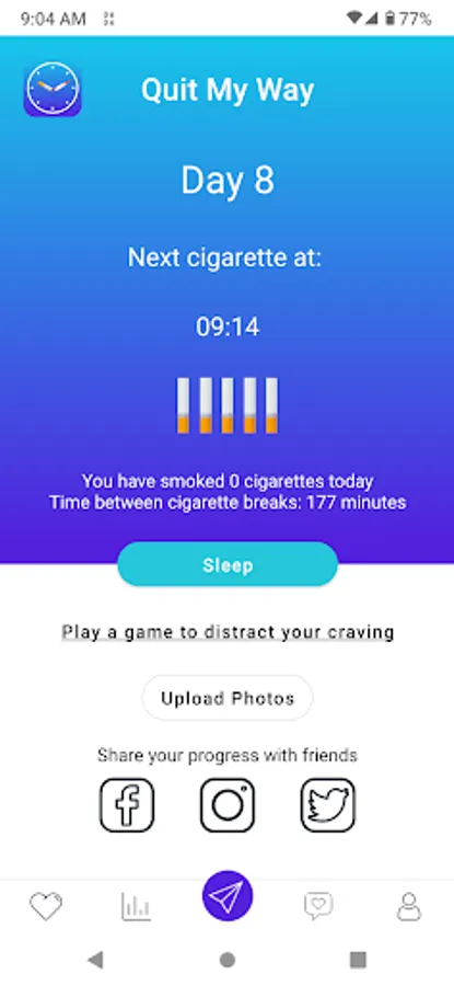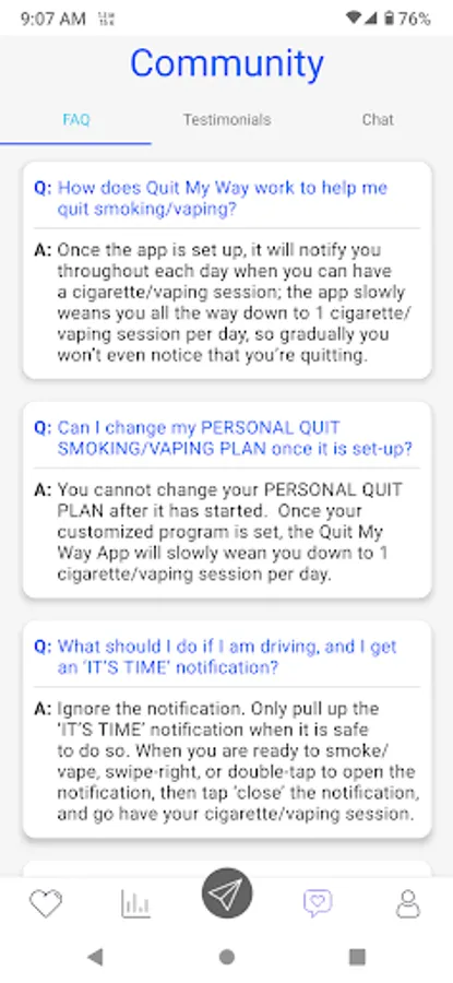 We've helped customers worldwide achieve their goals of living a healthy, nicotine-free life by educating, motivating, and supporting them through the app. Your personalized Quit My Way program provides you with real-time feedback on how many cigarettes or vaping sessions you've had for the day, how many you have left, as well as a supportive message every evening to keep you motivated and on track.