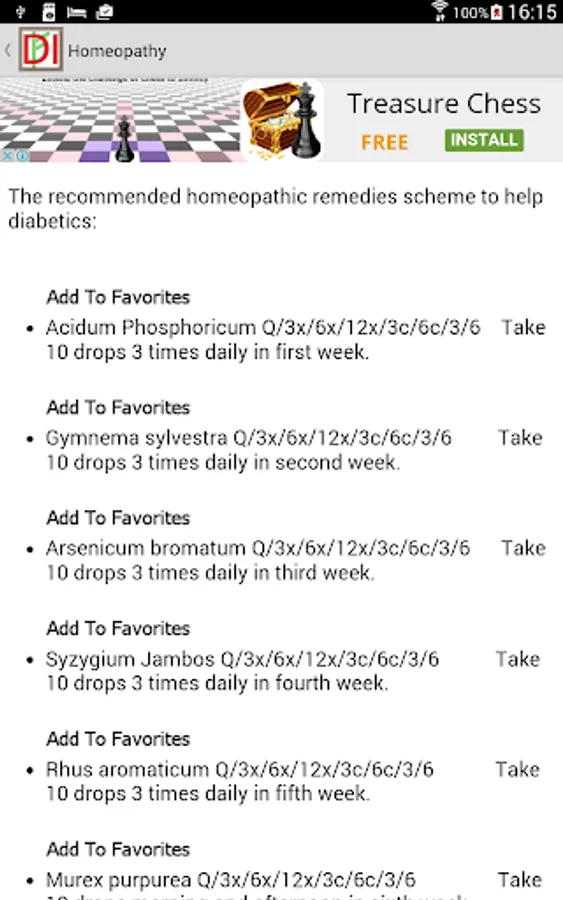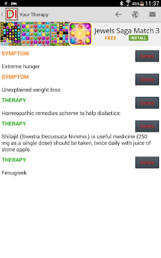 Finally, tap on Your Therapy. You will see a list of symptoms (in orange) mixed with a list of remedies (green) that you have selected. Taken together, the symptoms and the remedies form your therapy. Now all you have to do is obtain the remedies and start the process of eventual improvement of your health.