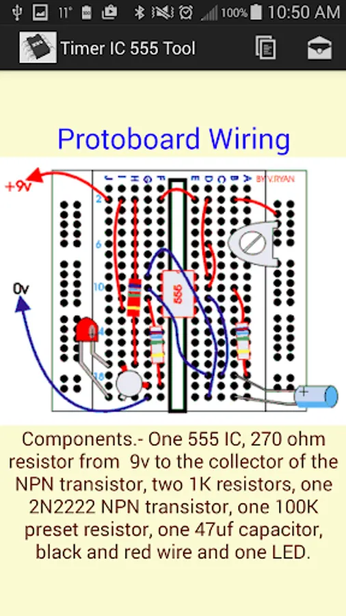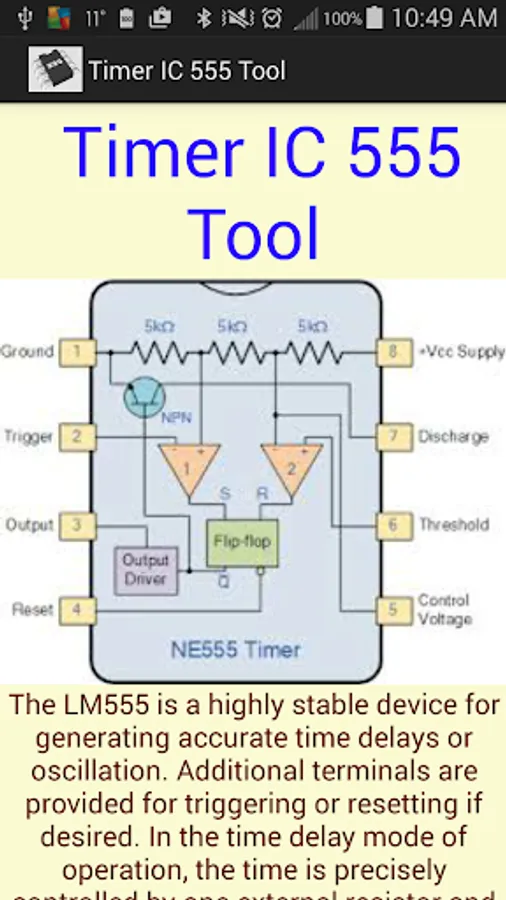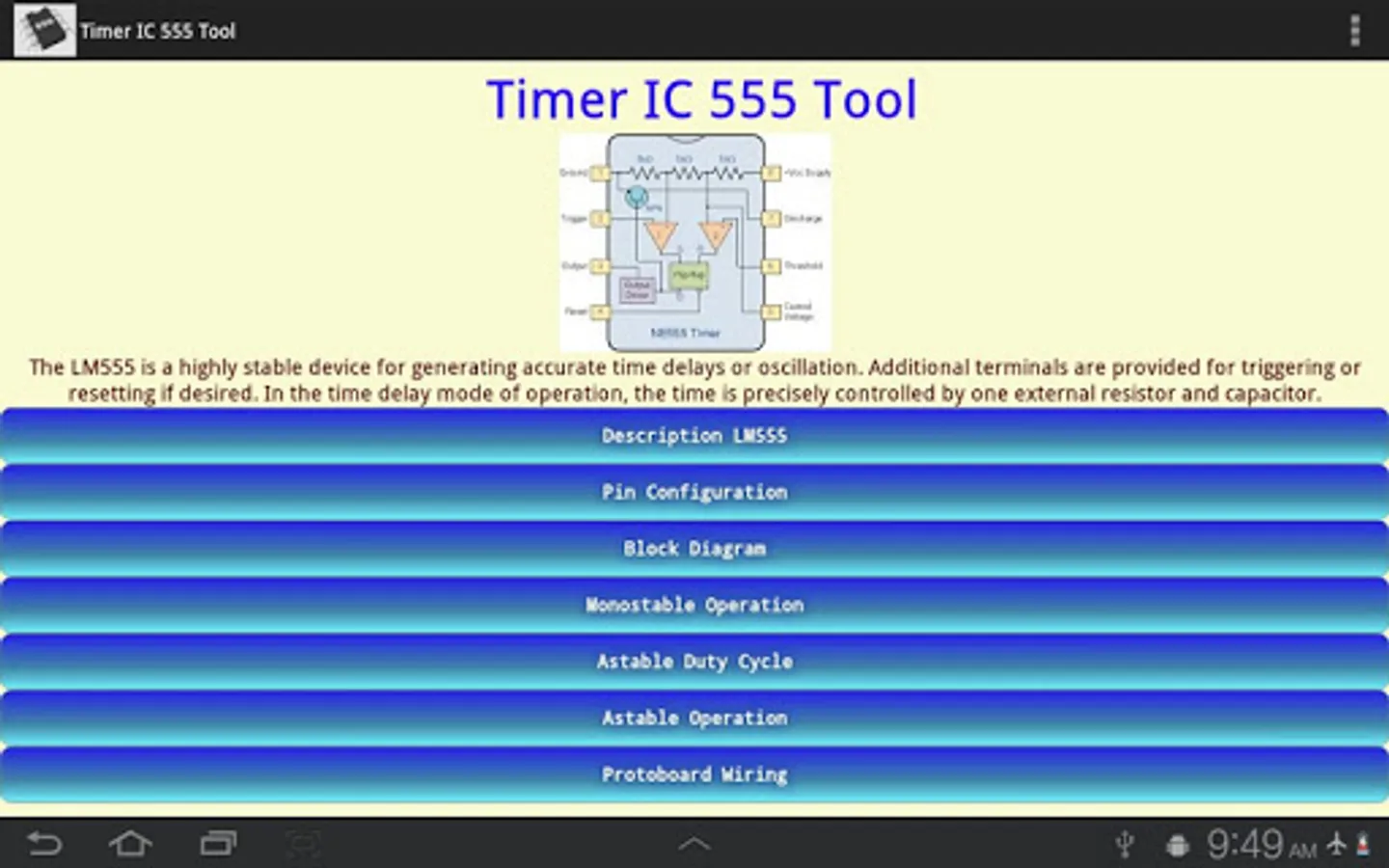 The app tries to be a reference of LM555 for students, teachers and hobbyists of electronic.