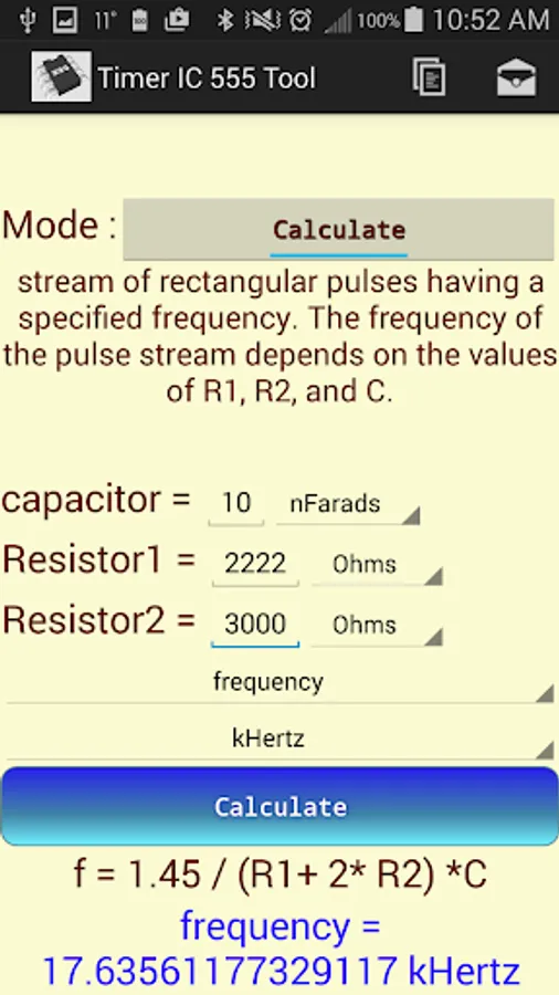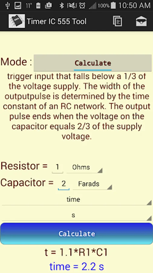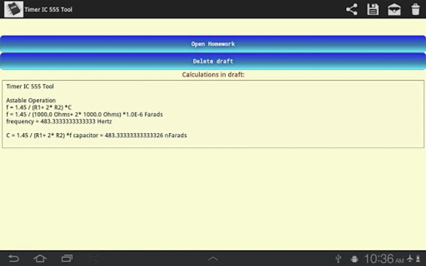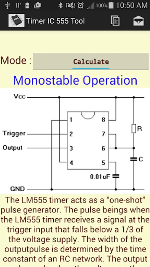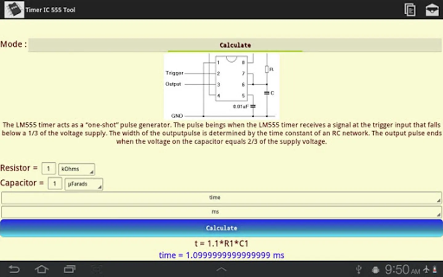 You can calculate time for monostable mode, frequency and duty cycle for astable mode. The advantage of this app is you can decide if you start with capacitor, resistor or frequency. You can learn about block diagram, functions, operations mode and a wiring option on protoboard.