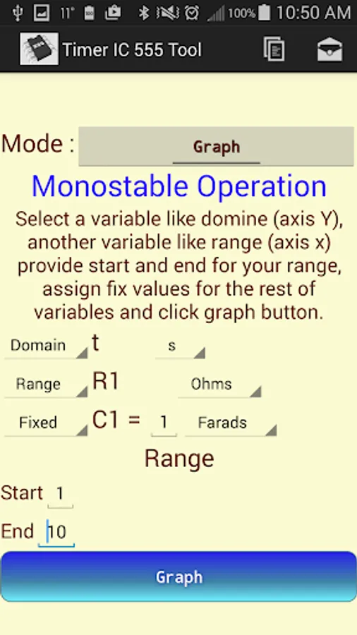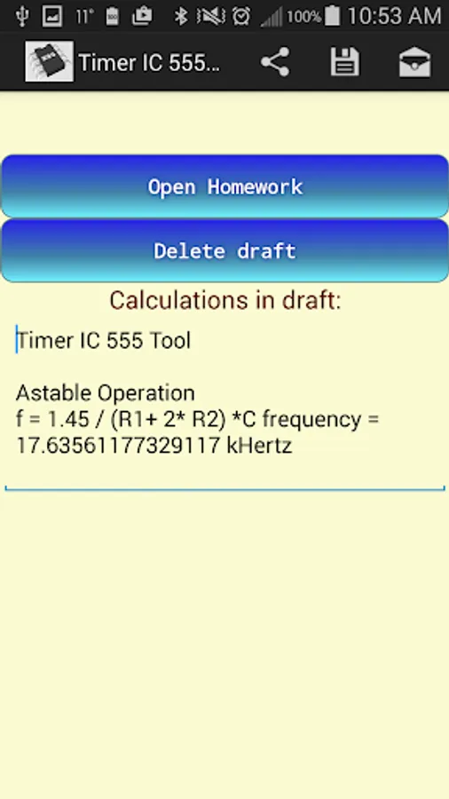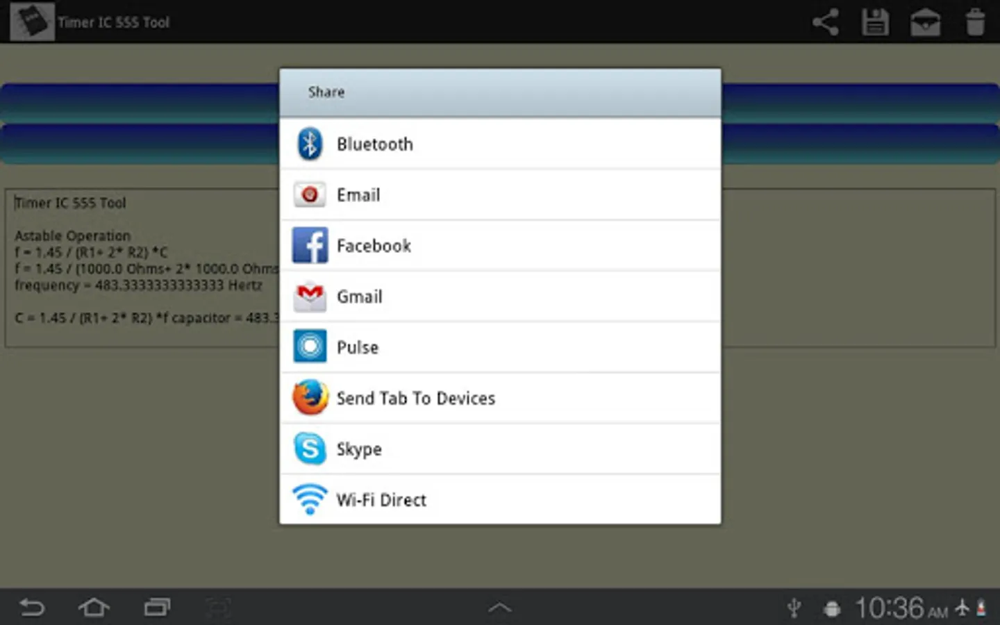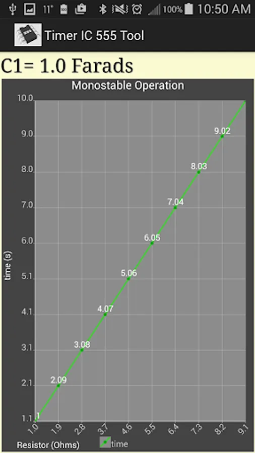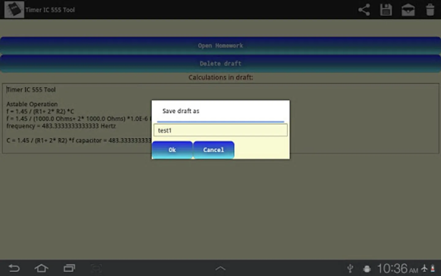You can calculate time for monostable mode, frequency and duty cycle for astable mode. The advantage of this app is you can decide if you start with capacitor, resistor or frequency. You can learn about block diagram, functions, operations mode and a wiring option on protoboard.