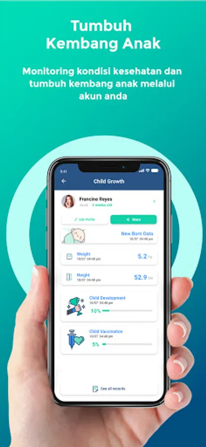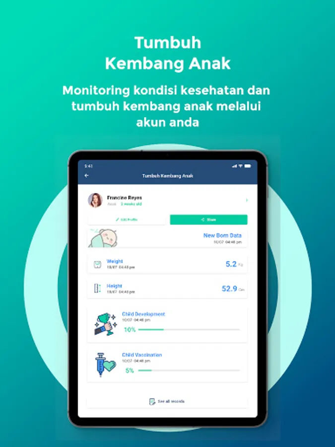 Monitor your child's growth from various aspects. This feature will tell your child nutritional adequacy. There are also child vaccination and child's social/emotional, language/communication, cognitive, and physical development which you can monitor by age.