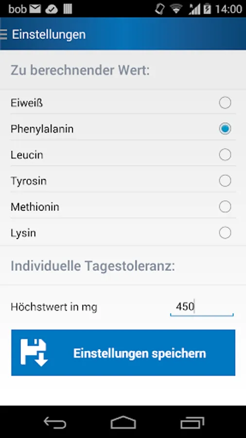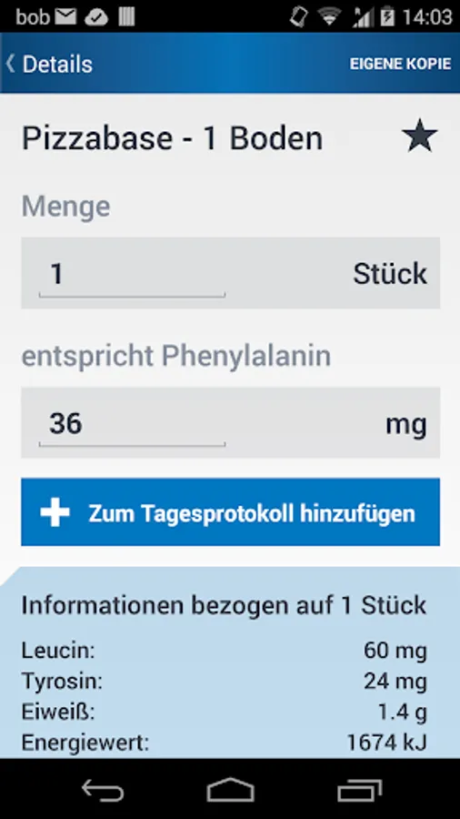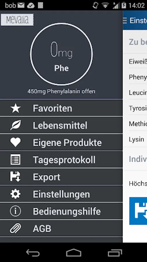 With Mevalia EASY DIET may include protein and amino acid levels, such as phenylalanine, leucine, tyrosine, methionine or lysine, are calculated and recorded in daily reports. The app is therefore particularly useful for people who are affected by congenital metabolic disorders of protein metabolism, such as phenylketonuria (PKU) hyperphenylalaninemia (HPA), tyrosinemia, and much more. Also limits the individual values can be defined. When the value is exceeded Mevalia EASY DIET has an immediate out.