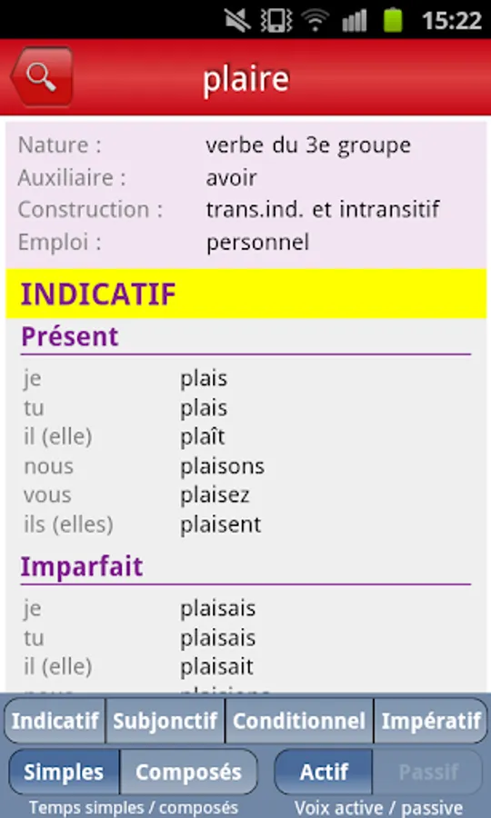 If you entered a conjugated form, the scanning engine, combined with search engine provides accurate analysis of this form (voice, mood, tense, person), the verb is a simple time or compound.