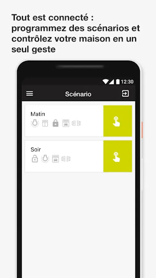- Customize and activate scenarios, simultaneous actions according to your rhythm of life and your habits. In the morning, leaving your home, activate your alarm, turn off your lights and open your garage door