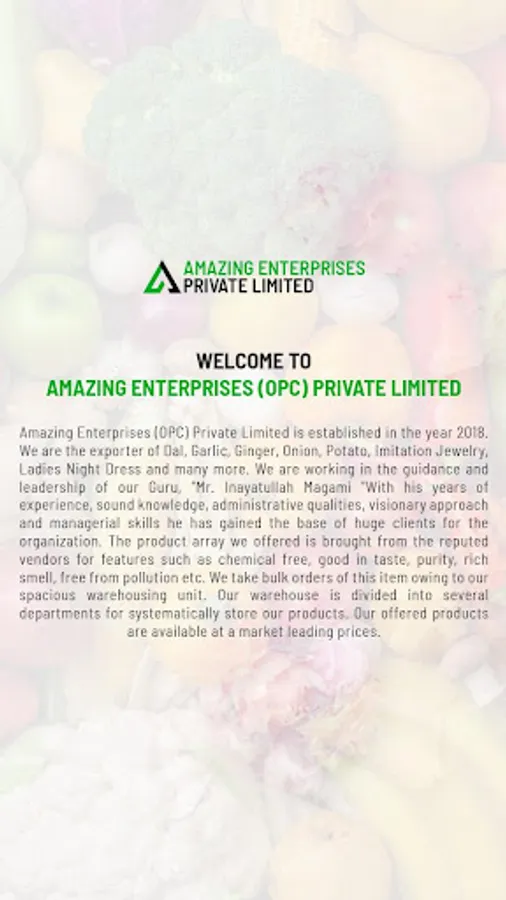 Amazing Enterprises (OPC) Private Limited is established in the year 2018. We are the exporter of Dal, Garlic, Ginger, Onion, Potato, Imitation Jewelry, Ladies Night Dress and many more. We are working in the guidance and leadership of our Guru, "Mr. Inayatullah Magami "With his years of experience, sound knowledge, administrative qualities, visionary approach and managerial skills he has gained the base of huge clients for the organization. The product array we offered is brought from the reputed vendors for features such as chemical free, good in taste, purity, rich smell, free from pollution etc. We take bulk orders of this item owing to our spacious warehousing unit. Our warehouse is divided into several departments for systematically store our products. Our offered products are available at a market leading prices.