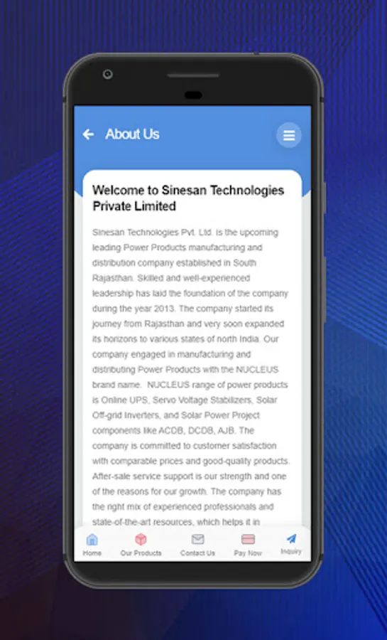 Sinesan Technologies Pvt. Ltd. is the upcoming leading Power Products manufacturing and distribution company established in South Rajasthan. Skilled and well-experienced leadership has laid the foundation of the company during the year 2013. The company started its journey from Rajasthan and very soon expanded its horizons to various states of north India. Our company engaged in manufacturing and distributing Power Products with the NUCLEUS brand name. NUCLEUS range of power products is Online UPS, Servo Voltage Stabilizers, Solar Off grid Inverters and Solar Power Project components like ACDB, DCDB, AJB. The company is committed to customer satisfaction with comparable prices and good-quality products. After-sale service support is our strength and one of the reasons for our growth. The company has the right mix of experienced professionals and state-of-the-art resources, which helps it in completing all the specified projects with utmost perfection. We follow ethical business policies, transparent dealings, fair pricing, flexible payment options, and prompt deliveries for the retention of our satisfied clientele. We are having our admission in the North and West states of our country and expanding our horizons to serve the entire nation. Our appearance in Rajasthan, Delhi, Punjab, Gujarat, Maharashtra, and UP.