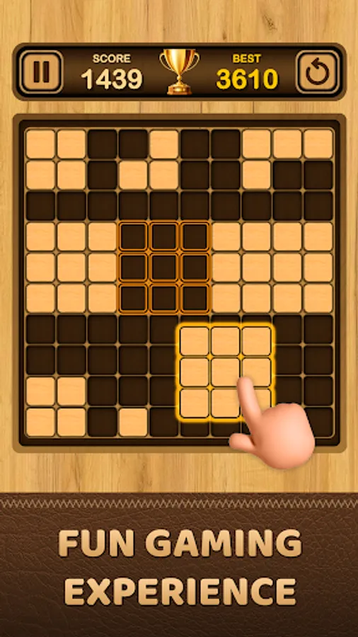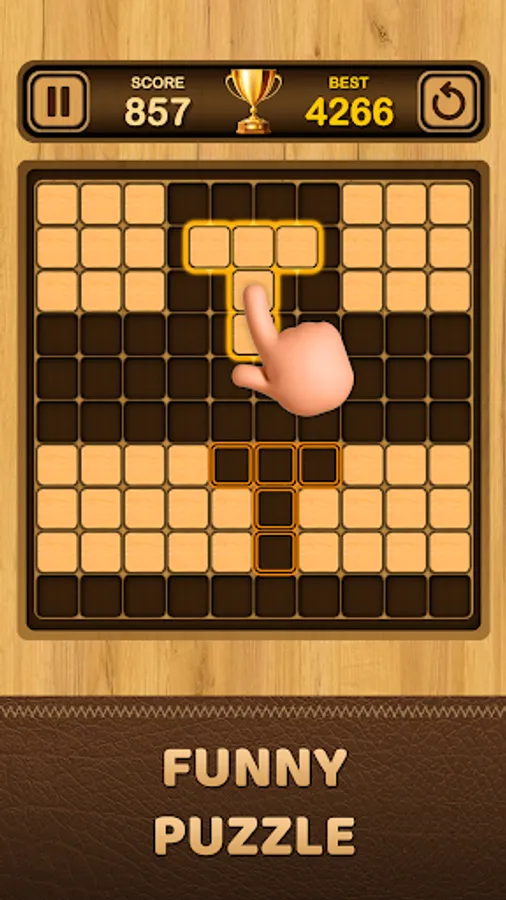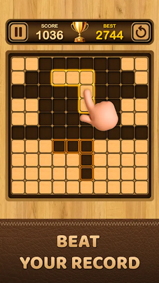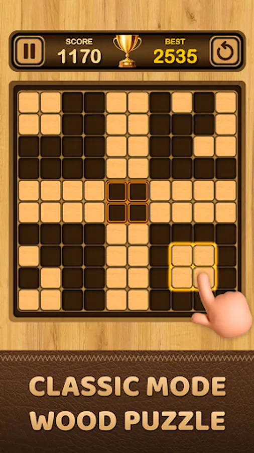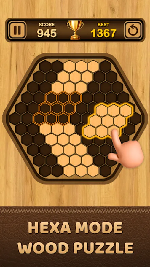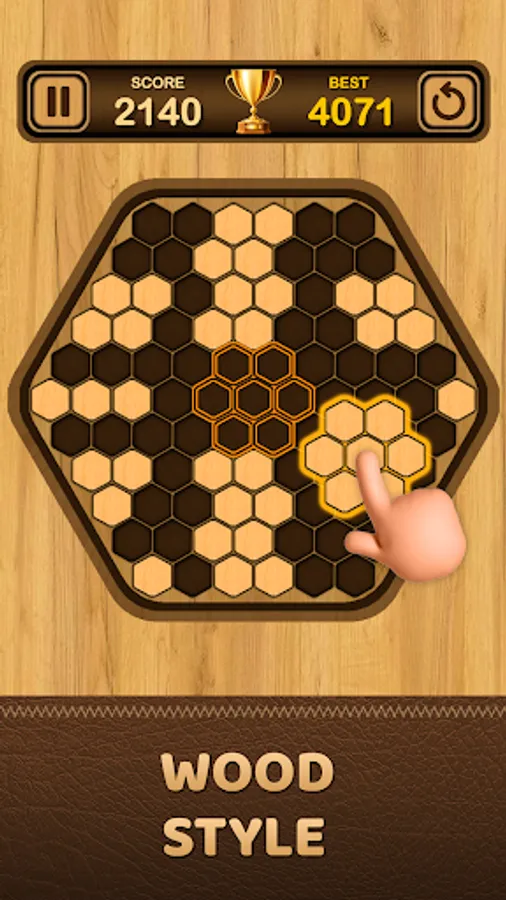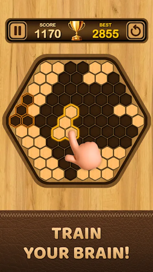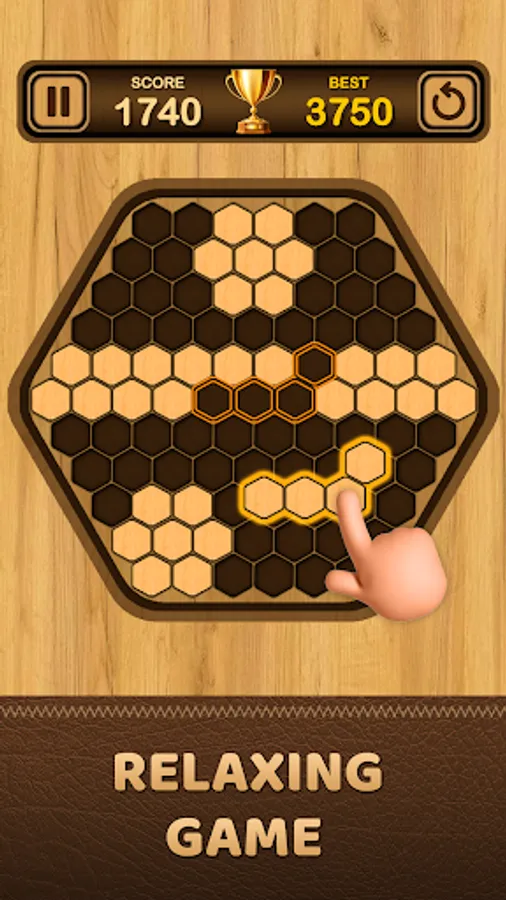 Your task is to arrange oak blocks and hexagons of various shapes in a 10x10 grid and hexagon grid . As soon as you fill in a vertical or horizontal line in the grid, the wooden blocks will disappear, making room for new ones. As soon as there is no space for blocks and hexagons in the grid, the game will be over.