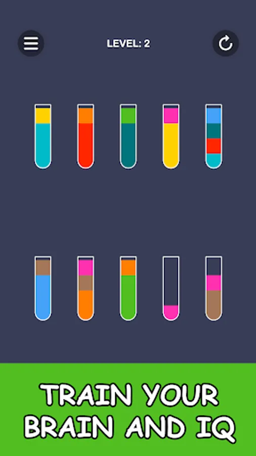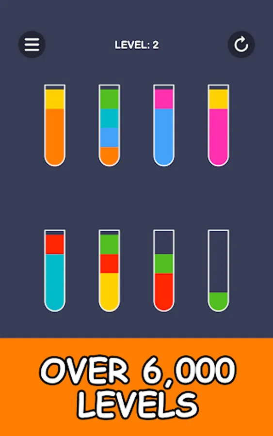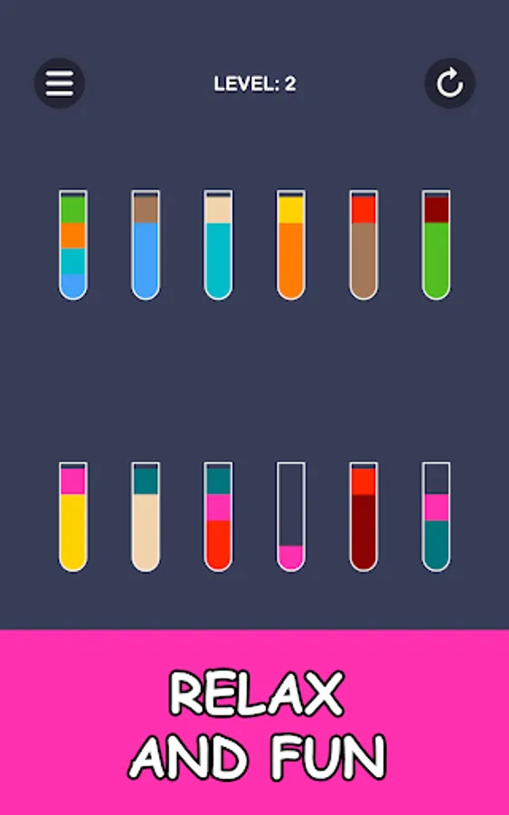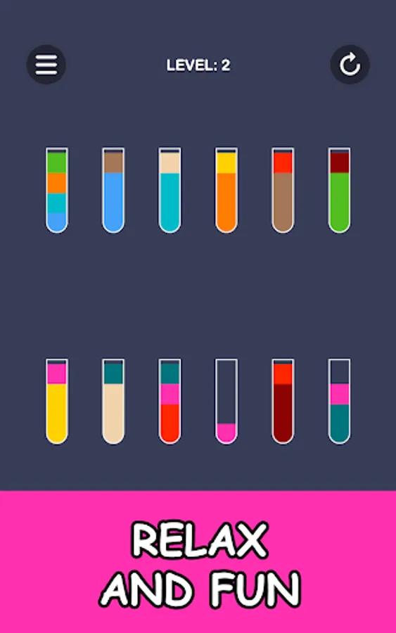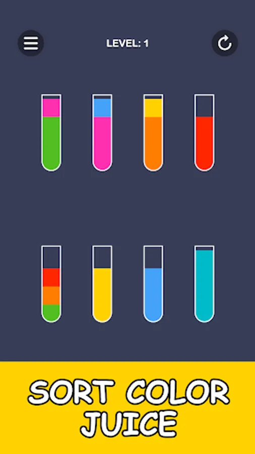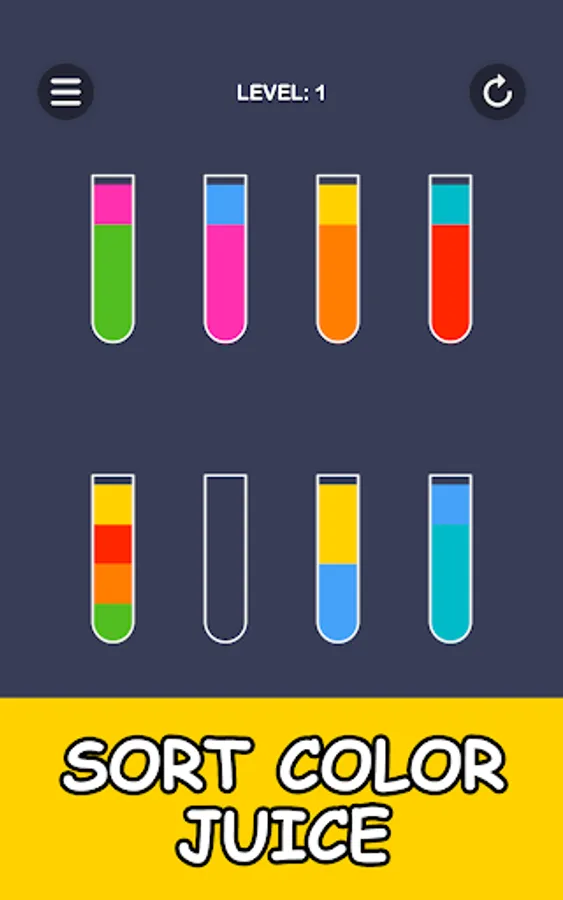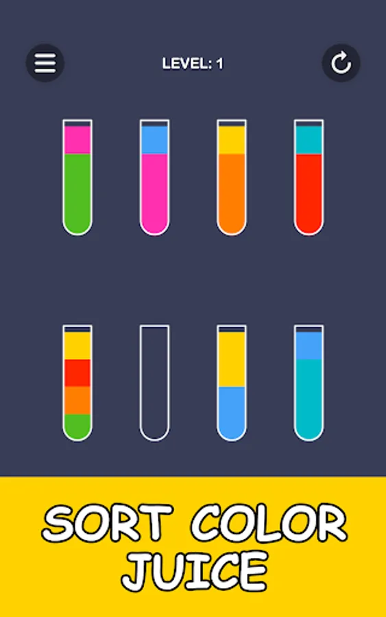 Color puzzle in which you have to pour juice into glasses. To pass the level, all the colors of the juice must be in separate glasses.
