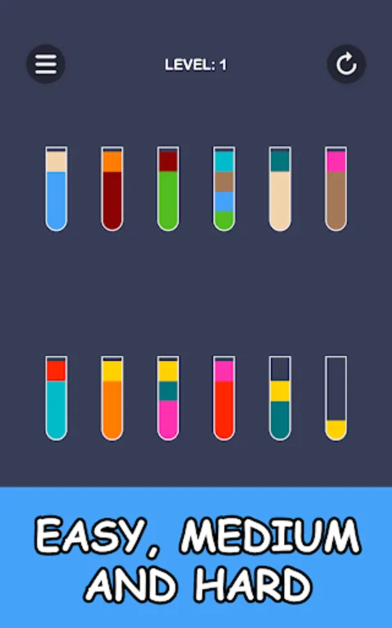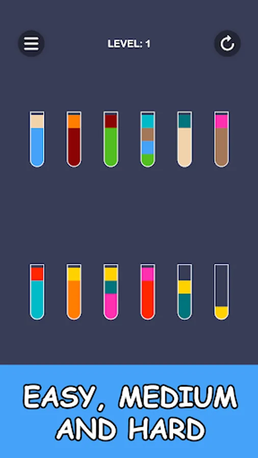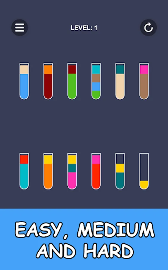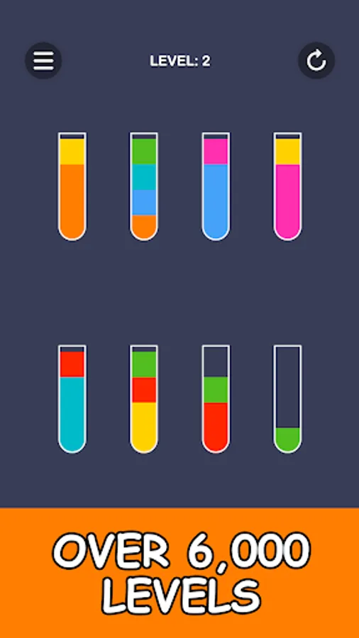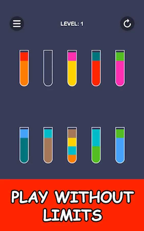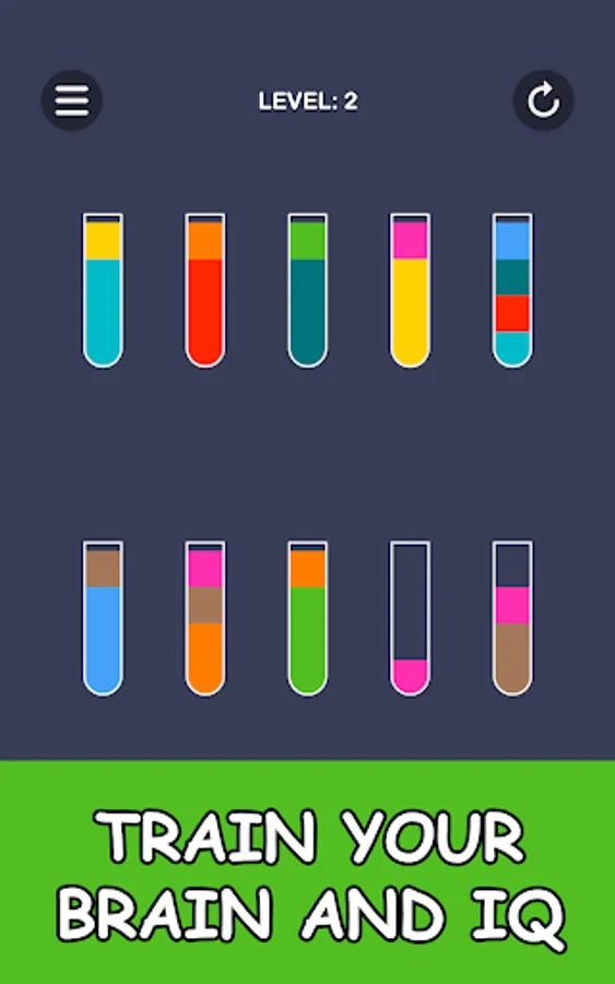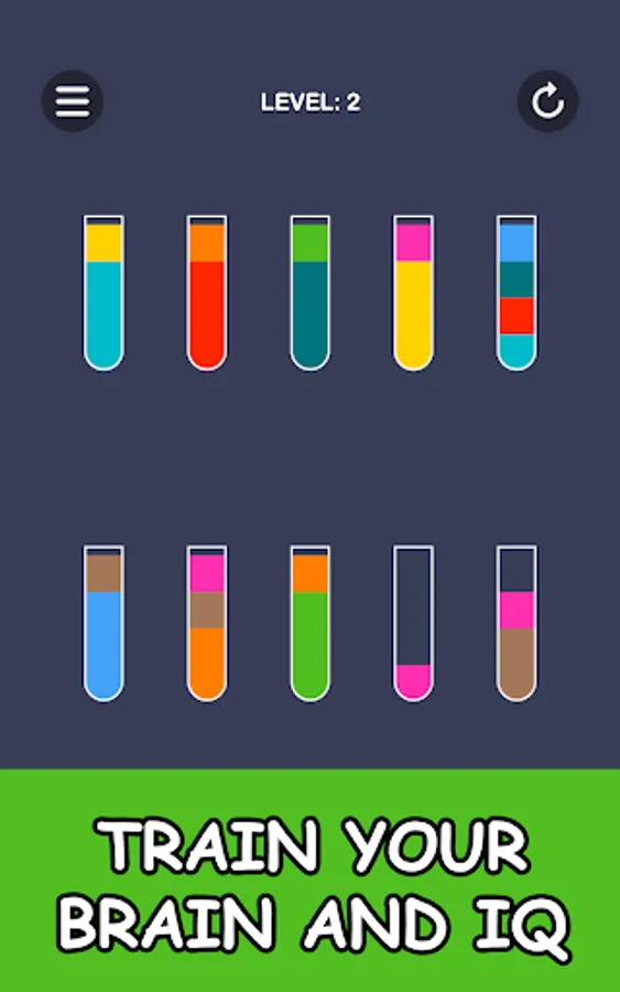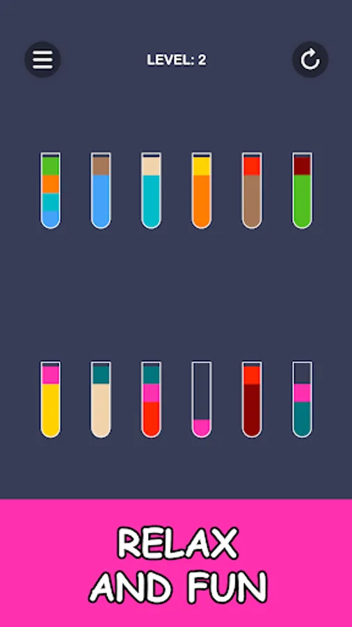 Color puzzle in which you have to pour juice into glasses. To pass the level, all the colors of the juice must be in separate glasses.