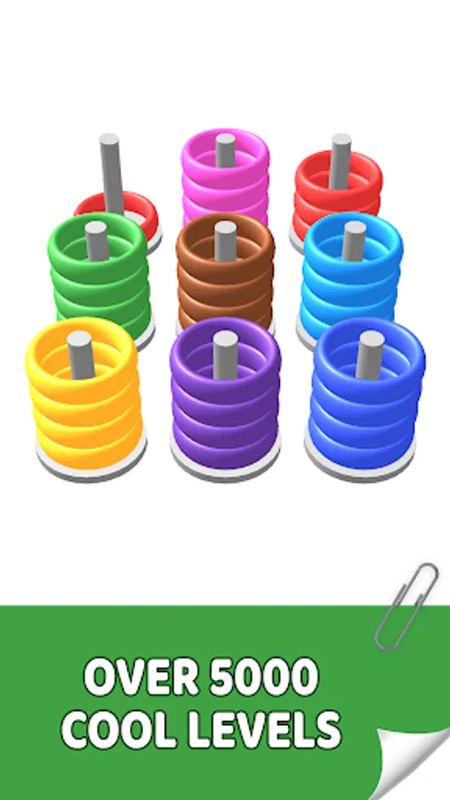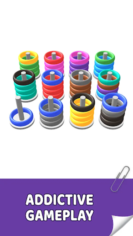 Ring Stack - Color Sort 3D is a new classic color sorting puzzle game where you have to sort colored rings into stacks.