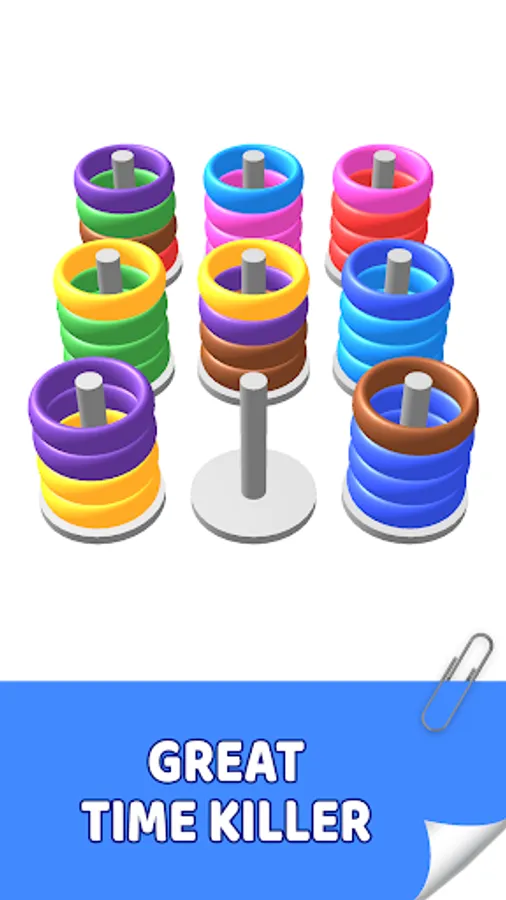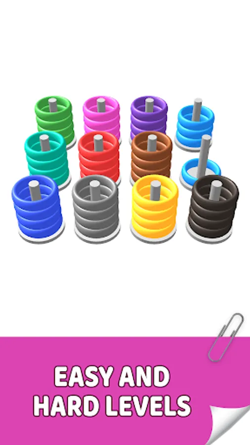 The rules of the game are very simple. Touch the ring and select the stack where you want to move it. All rings should end up in separate piles, only after that the level will be completed. Use your logic and sort the colors correctly.