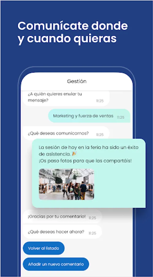 Communication is not lacking. Make requests, queries or suggestions on the fly through a friendly conversational format. Do you want to share an experience? We make it very easy for you.
