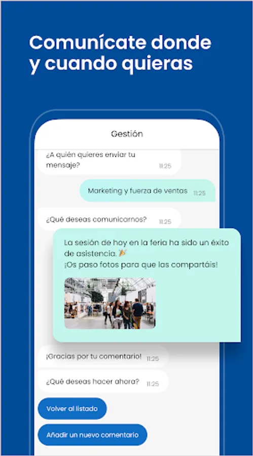 ● Talk to your company to send feedback: doubts, suggestions, queries or whatever comes to mind; with follow-up of conversations via chat and assistant for sending chatbot type