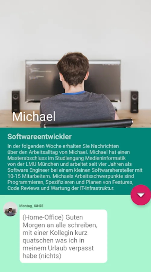 The app was developed for a study by the Chair of Media Informatics at LMU Munich. With the help of the app, two different concepts for professional orientation are compared: chat messages and blog entry. The professions "Software Developer" and "Product Manager" will be presented.