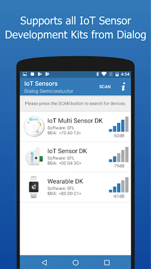 The SmartBond™ IoT Sensors app from Dialog Semiconductor is a mobile application that works with the IoT Sensor Development Kits based on Dialog’s DA14585, DA14583 and DA14681 Bluetooth® Low Energy SoCs.