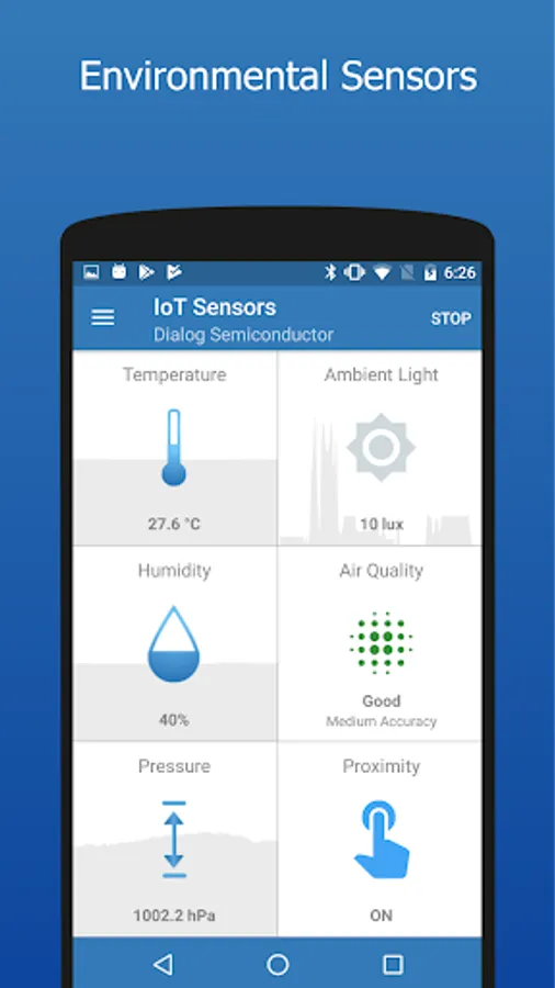 With the app you can visualize the raw data coming from the development kit sensors, including accelerometer, gyroscope, magnetometer, temperature, pressure and humidity.
