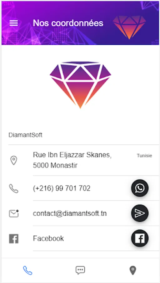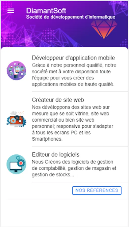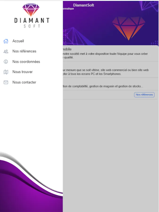 It is a showcase application of the company DiamantSoft wired with a site created with the CMS WordPress, this application allows to quote the reference of the company as well as the coordinates.