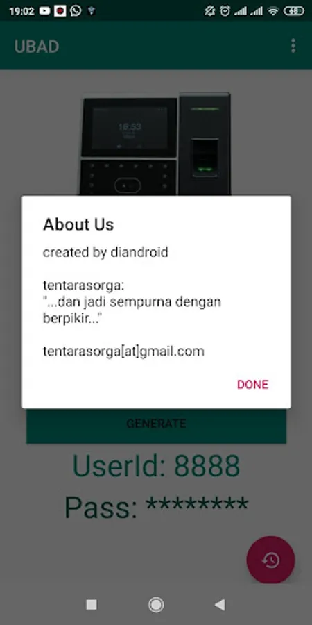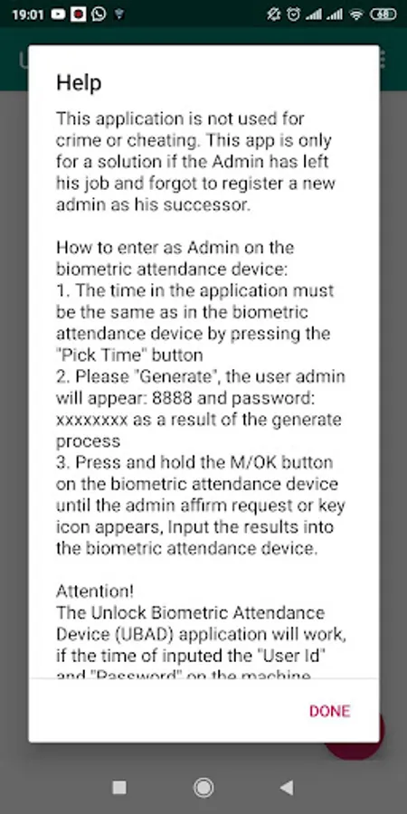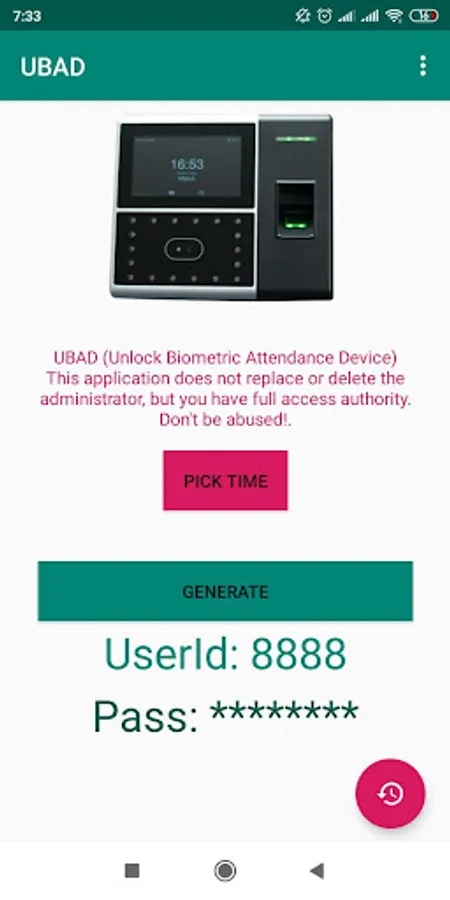 The Unlock Biometric Attendance Device (UBAD) application will work, if the time of inputed the "User Id" and "Password" on the machine is the same as the PICK TIME generated. Do not let the minutes change, because the password is only valid for one minute since the pick time is generated.