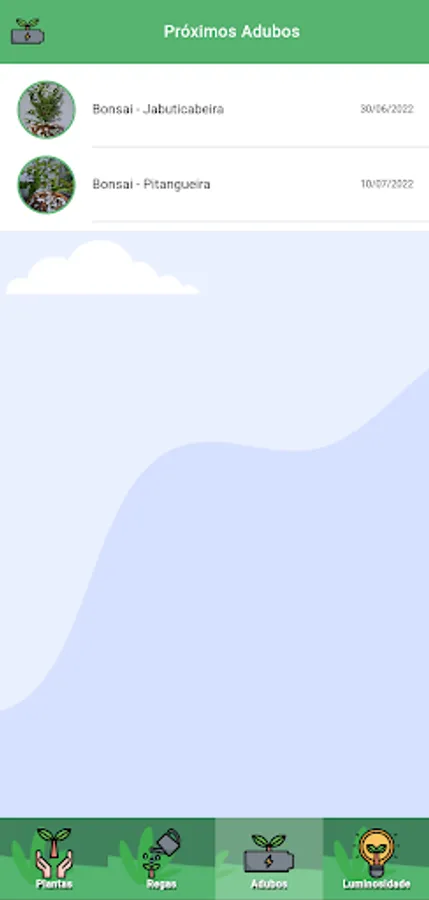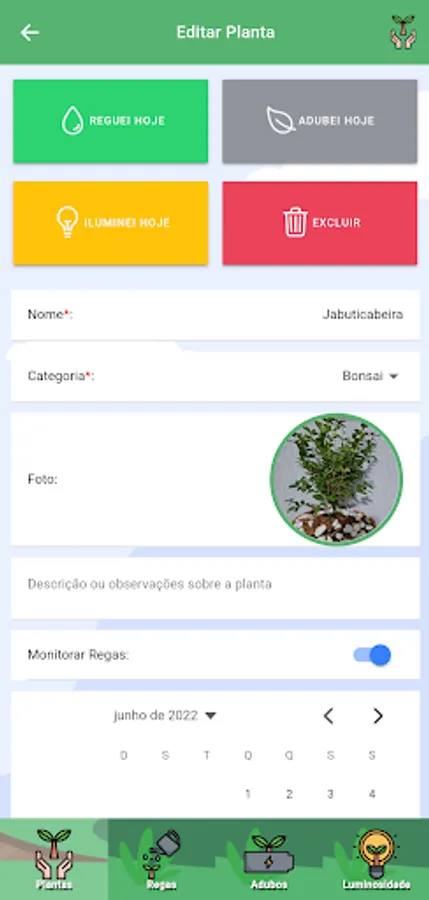 Register and organize your plants with a photo, with the possibility of activating the monitoring of irrigation, fertilization and luminosity.