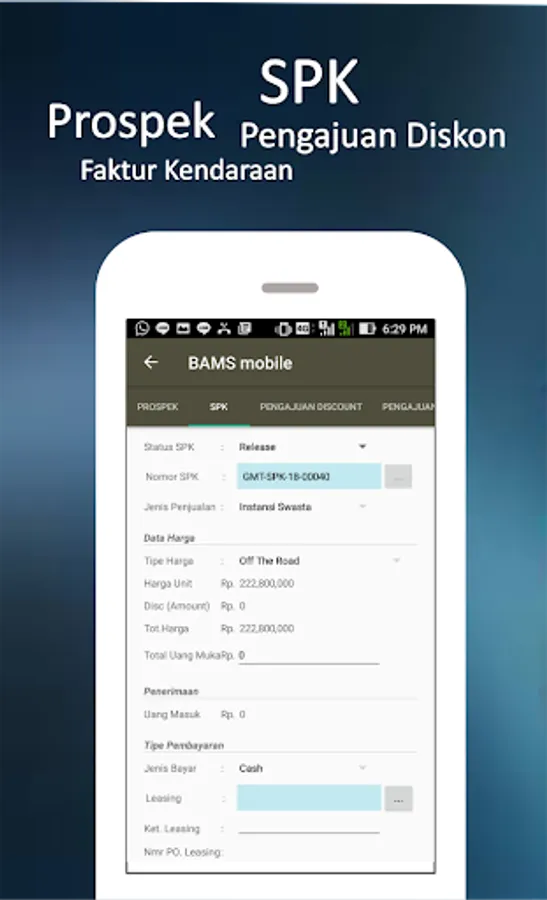 BAMS Mobile Sales Application is a sales application to enter customer data, customer orders, price requests and others. The BAMS application is used by sales throughout the PT. Bosowa Berlian Motor to market Mitsubishi vehicles in eastern Indonesia.