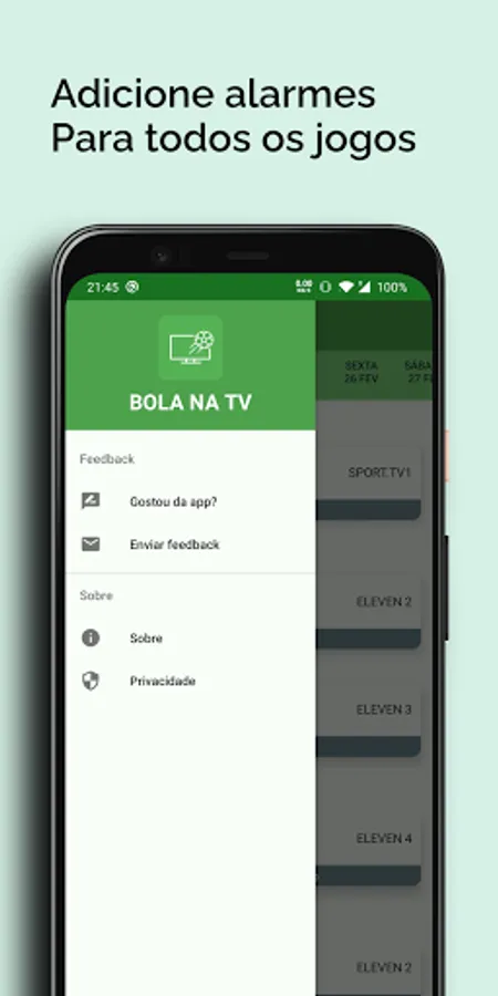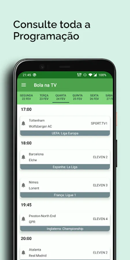 Bola na TV is an application that lets you know where all football matches will be broadcast on Portuguese television and at what time. It also offers information on which competition each game is inserted in and also the possibility to create alarms for each game.