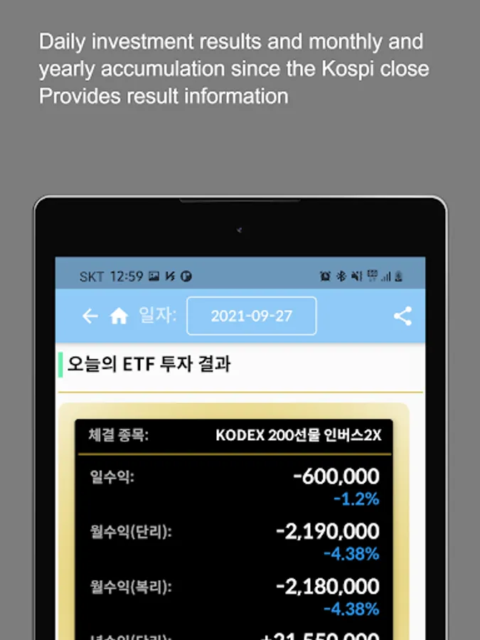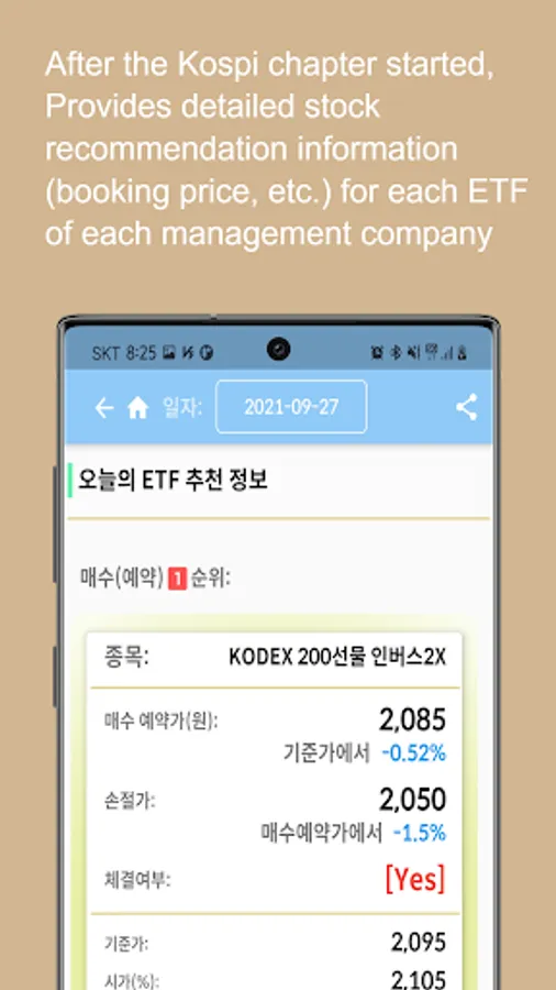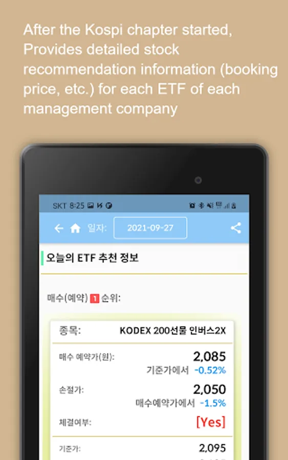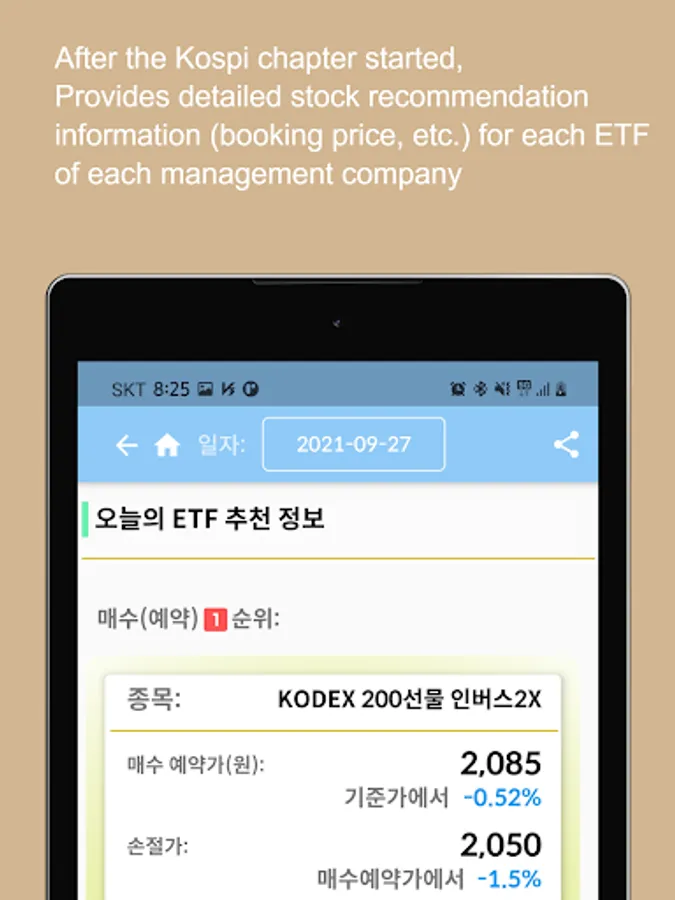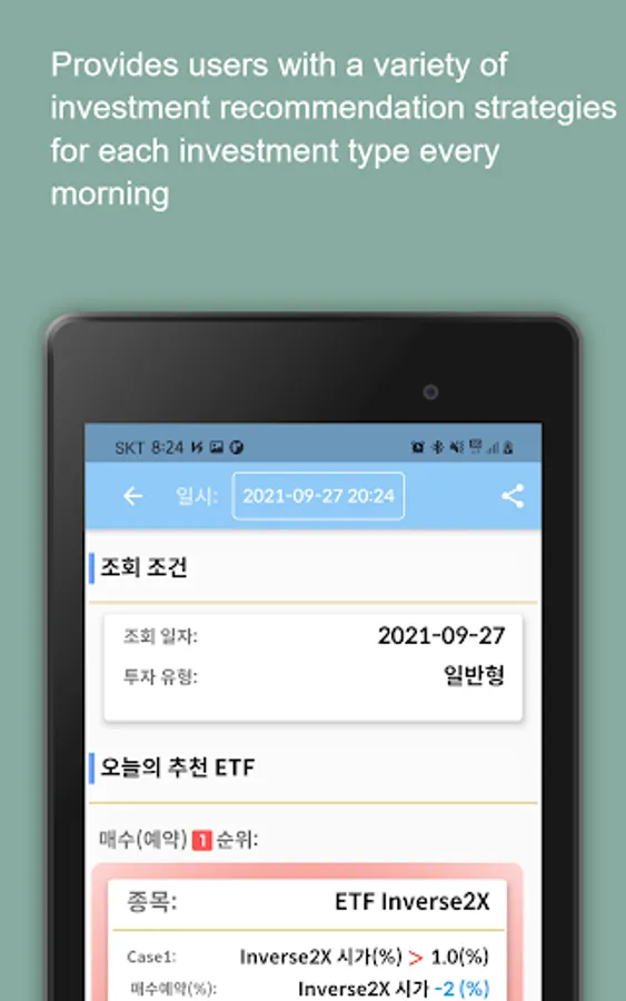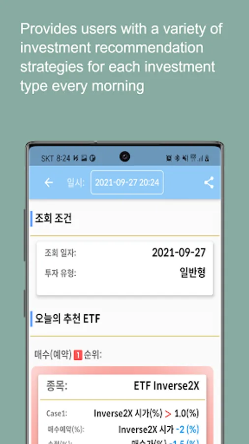 It provides information on the best recommended stocks (leverage, inverse 2X), reservation price, and stop-loss price through data based on same-day buying and same-day selling.