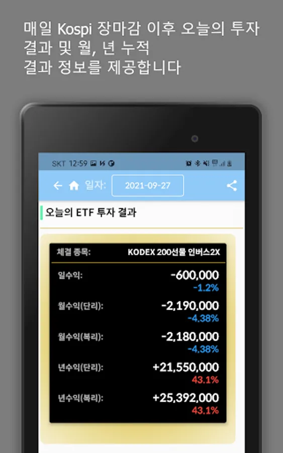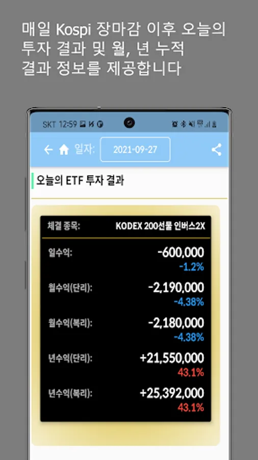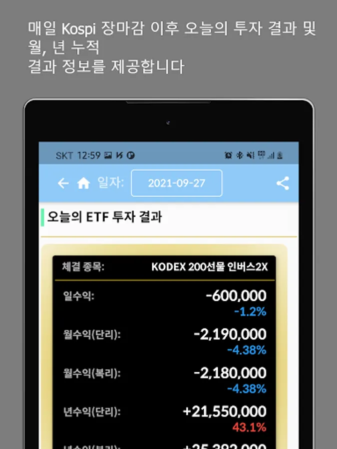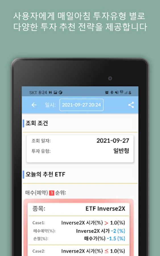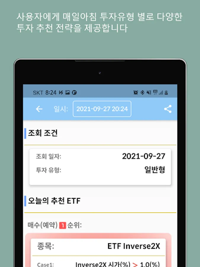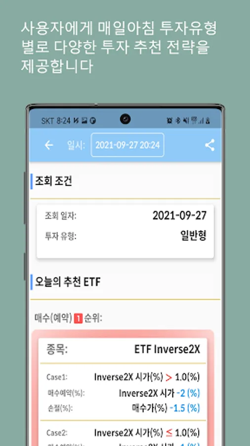 It provides information on the best recommended stocks (leverage, inverse 2X), reserved purchase price, and stop-loss price through data based on same-day buying and same-day selling.