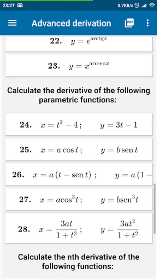 - Advanced derivation exercises section: logarithmic, implicit, inverse, nth derivative ... etc.
