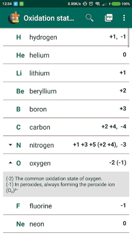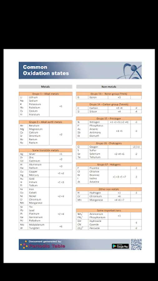 The app includes a downloadable PDF table with the main oxidation numbers of the most used elements in inorganic formulation in secondary education.