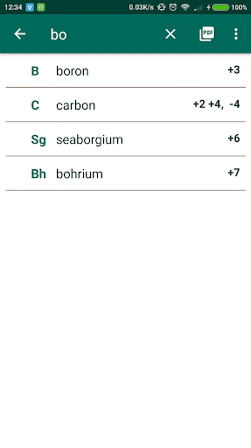 The list is presented ordered by atomic number. Search by symbol, name or value is allowed.