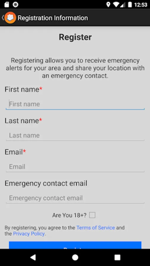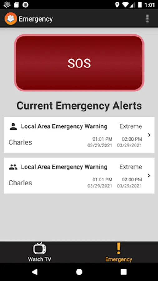 Emergency Alert Features (available for users who are 18 years old or older): sends alerts applicable to the area where the user is located, the user can enter information for a primary contact who can receive the user's location when the user is in an area of immediate high risk, the user can send their location to their primary contact at any time. The emergency alerts are originated by the US Integrated Public Alert and Warning System (IPAWS)