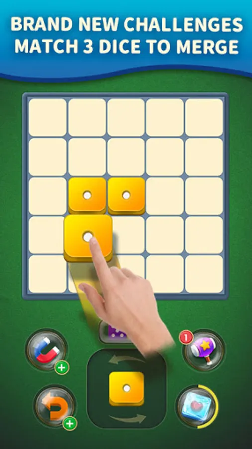 ▶ Match three or more dice with same dot or same number, to merge them horizontally, vertically, or both into a higher value.