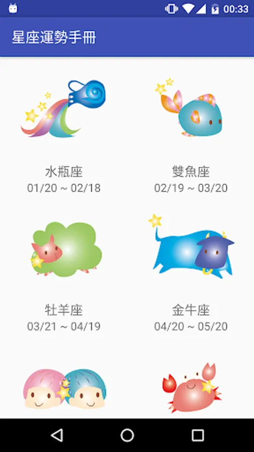 水瓶座、雙魚座、牡羊座、金牛座、雙子座、巨蟹座、獅子座、處女座、天秤座、天蠍座、射手座、摩羯座。