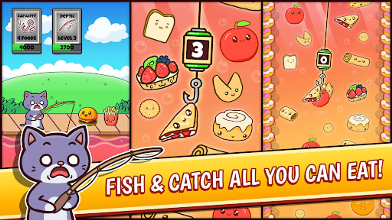 It's a crazy world, there's food in the ocean! Help your cat fish tons of cute foods in this amazing fishing game. Catch and collect cute foods that will talk to you and your cat. Feed the foods you catch to turn those foods into money. Go deeper into the ocean to discover more foods and surprises!