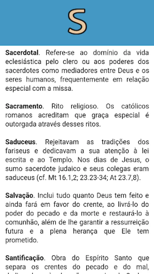 With a simple menu ordered by letters, browsing through theological dictionary is flexible and intuitive. Select the letter you want and access to the list of words in alphabetical order